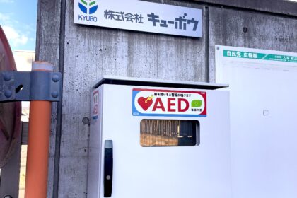 ▲「AEDは会社入り口の壁面に設置しています。緊急時はどなたでもご利用いただけます。」 株式会社キュ......