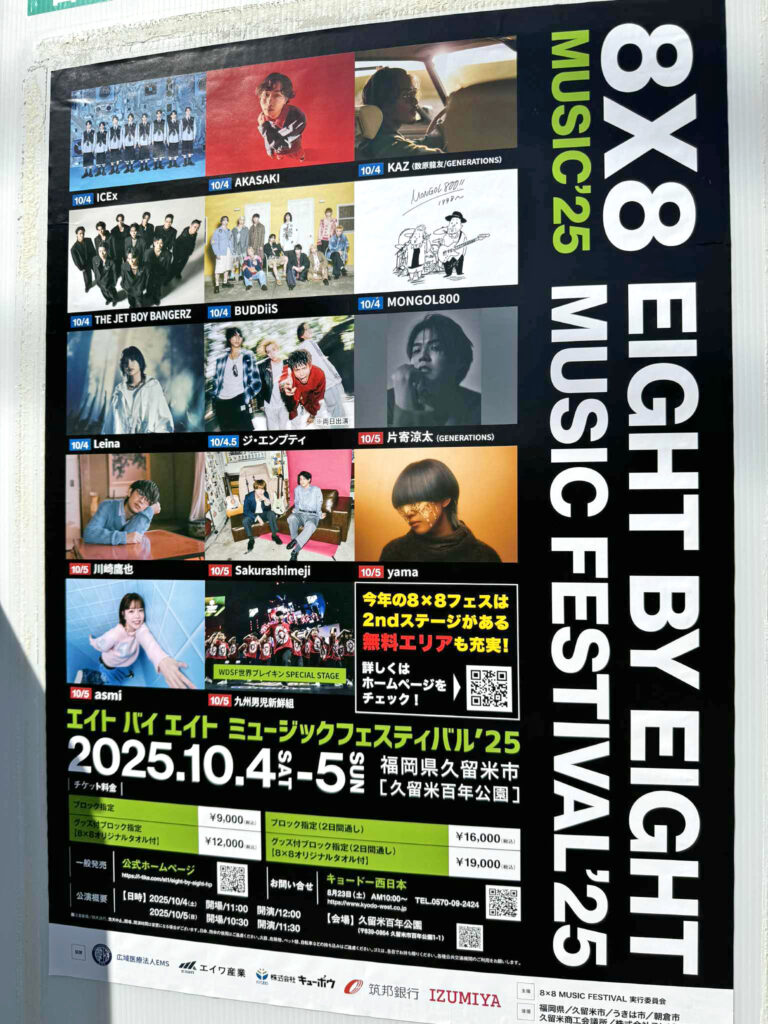 2025年10月4日(土)・5日(日)に福岡県久留米市・久留米百年公園にて開催される「8×8 MUSIC FESTIVAL 2025」に、株式会社キューボウは昨年に続きスポンサーとして参加いたします。 音楽を通じて集う人々のエネルギーが、地域の未来を切り拓く力になると信じ、私たちもその一翼を担えることを誇りに思います。