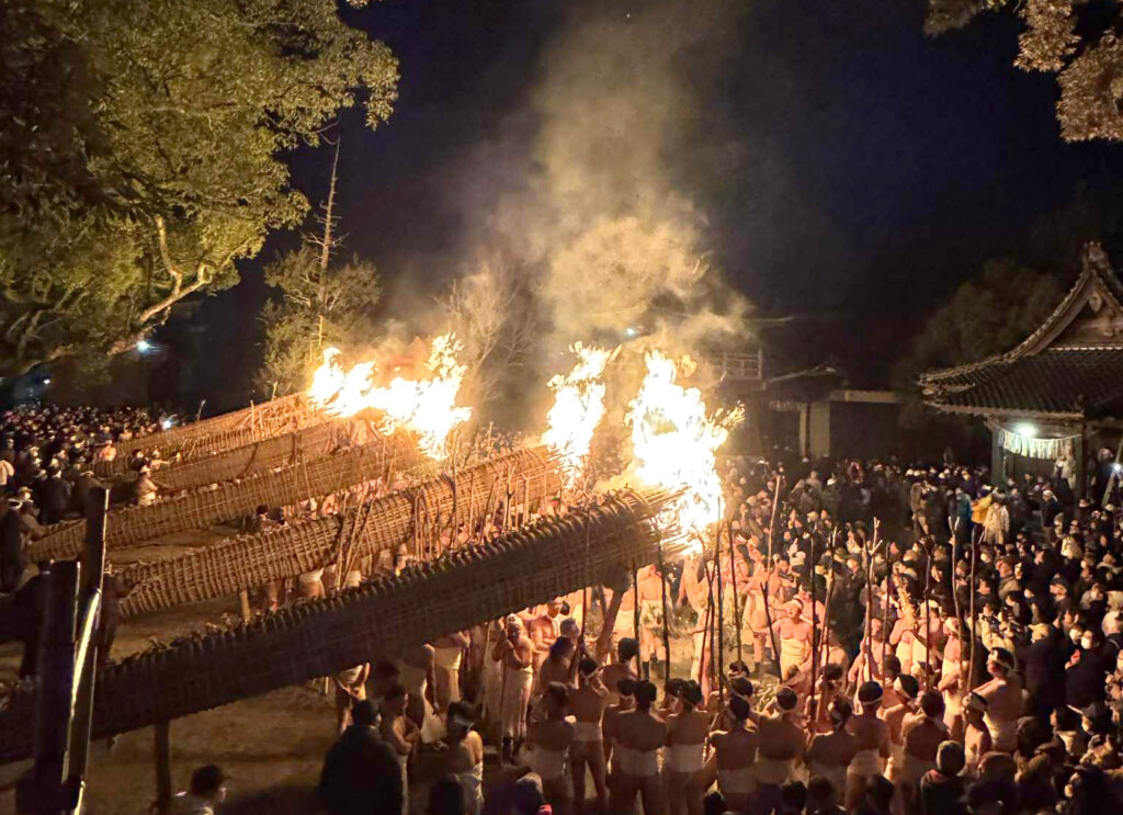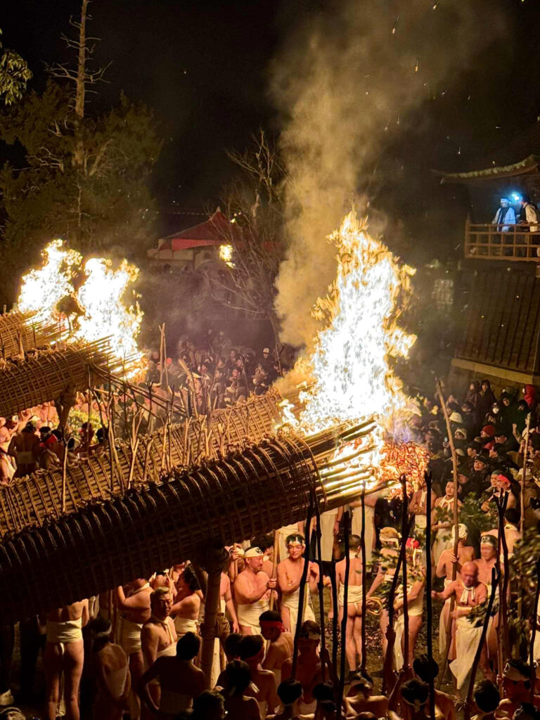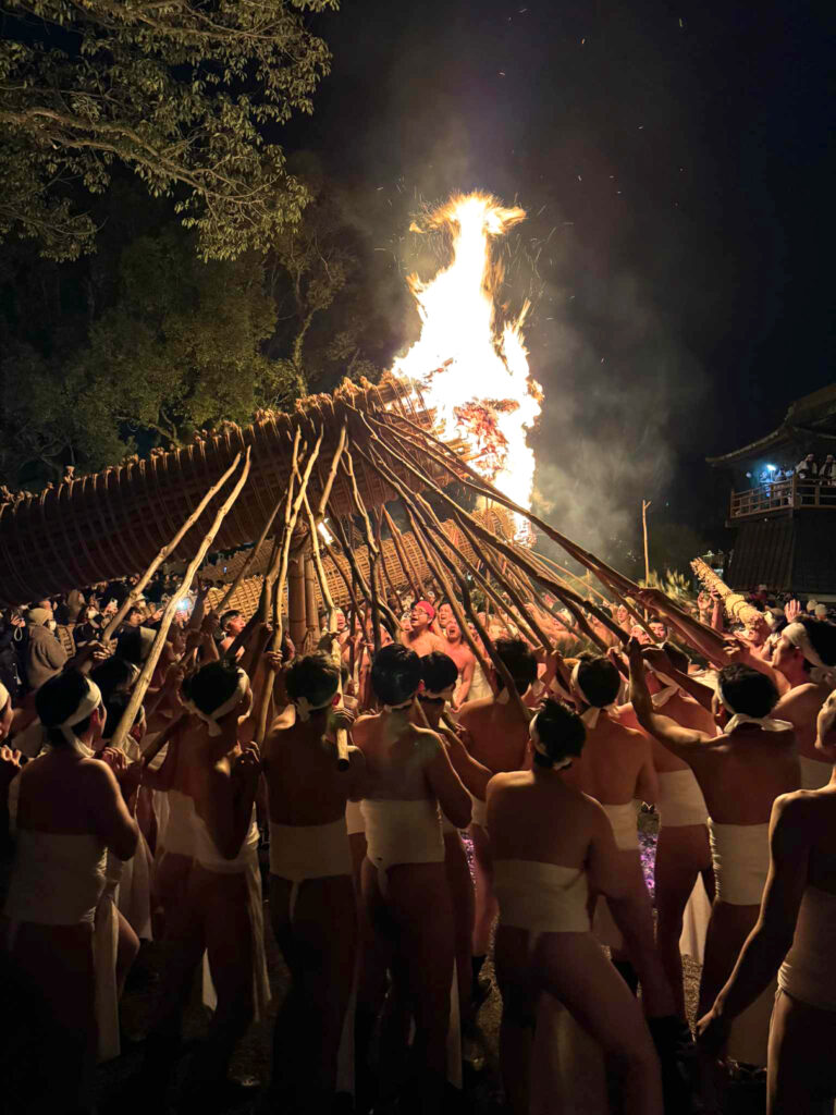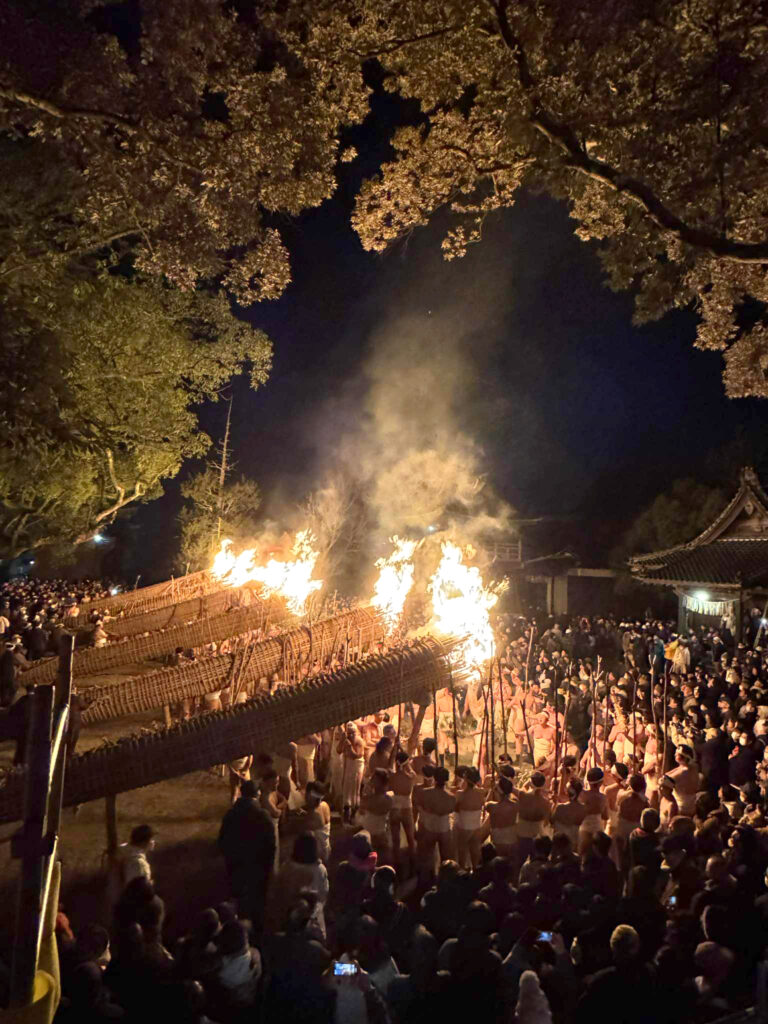 長さ約13m、重さ約1.2トンともいわれる日本一の大松明(たいまつ)6本が紅蓮の炎を上げ、数百人の裸の氏子若衆が「カリマタ」で支えながら境内を練り歩く姿は、まさに圧巻の一言でした。