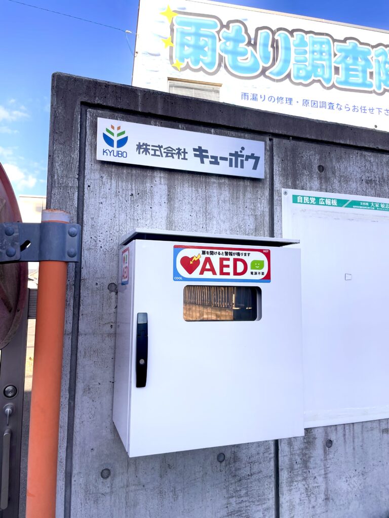 株式会社キューボウでは、地域の皆さんが安心して暮らせるように、会社入り口の壁面に AED(自動体外式除細動器) を設置しています。