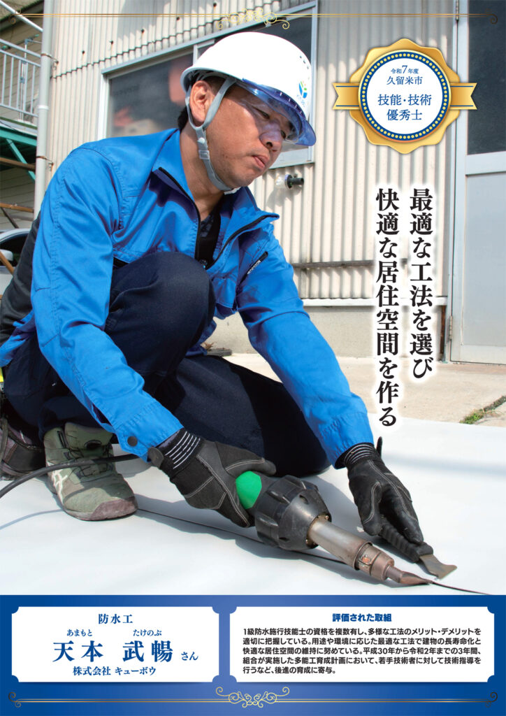 このたび、株式会社キューボウ(久留米市)に所属する防水工・天本 武暢(あまもと たけのぶ)が、令和7年度 久留米市「技能・技術優秀士」に選出されました。