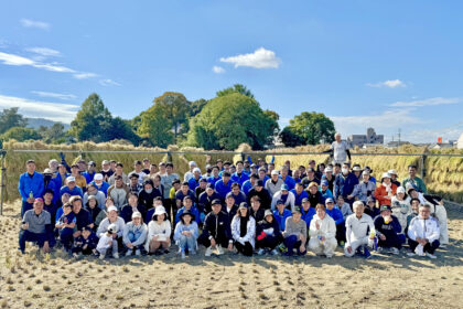 秋晴れの中、キューボウグループの社員が手掛けるもち米3反(約900坪)の田んぼで、今年も稲刈りを行い......